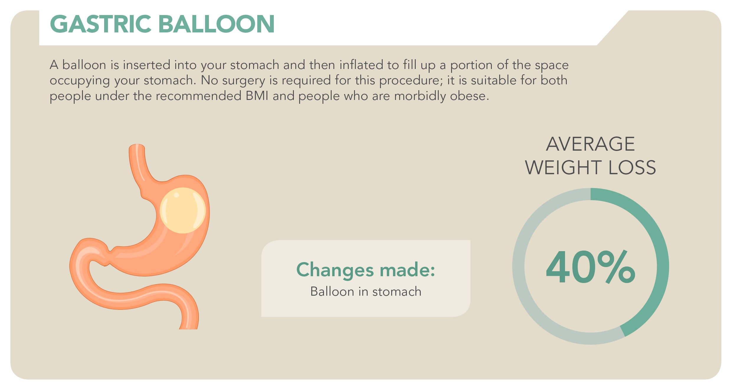 The balloon makes you feel full faster after eating, and will remain in your stomach for 6 months. Gastric balloon patients will have to work harder than patients of other bariatric procedures in order to achieve higher weight loss.