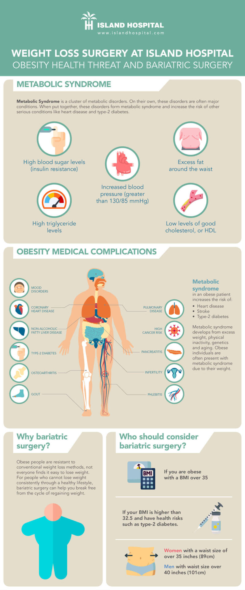 Before surgery, a patient has to go through consultation and evaluation with a surgeon or physician well-versed in bariatrics, like the consultants at Island Hospital. Be prepared to eat in moderation, follow diet plans (as instructed by your doctor) and exercise regularly. Bariatric surgery can help you reach a point where these conventional weight loss methods become effective again. It also causes changes in your hormones that makes you feel full faster and eat less, preventing overeating.