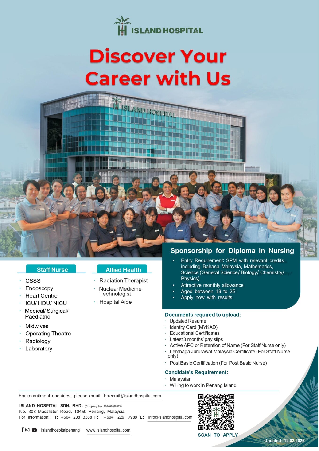 - Diploma in Nursing - SRN registered with Malaysian Nursing Board - Fresh graduates are welcome to apply - Working experience in related field will be an added advantage - Candidate with Post Basic certificate in will be an added advantage |
