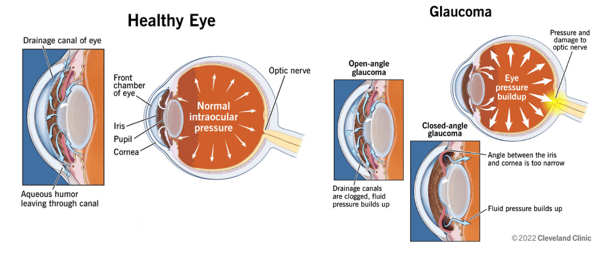 Glaucoma occurs when there is excessive pressure (intraocular pressure) within your eye. This pressure buildup happens when your eye’s natural fluid (aqueous humour) does not drain properly.