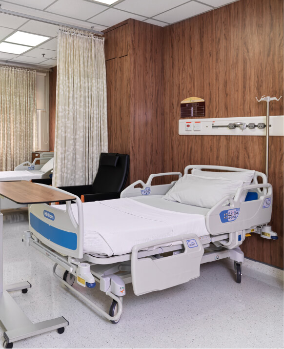 | Room Amenities • Hand Sanitiser • Air Conditioning • Recliner Chair • Cupboard • Side Board Locker • Cardiac Table | Bath Room • Toilet Paper • Water Heater • Plastic Shower Chair • Hand Soap Dispenser • Urinal Bottle • Washing Bowl |
