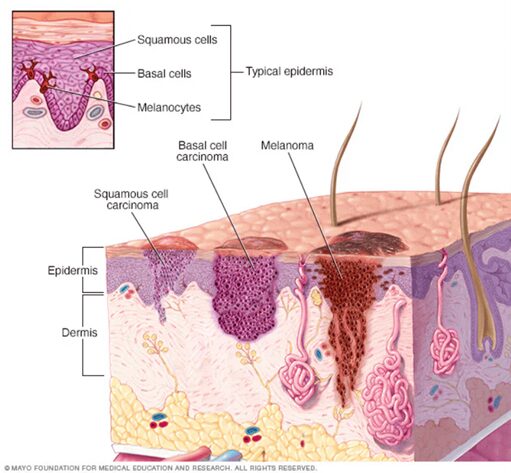Skin cancer begins in the top layer of our skin, known as the epidermis. Within the epidermis, there are three types of cells.