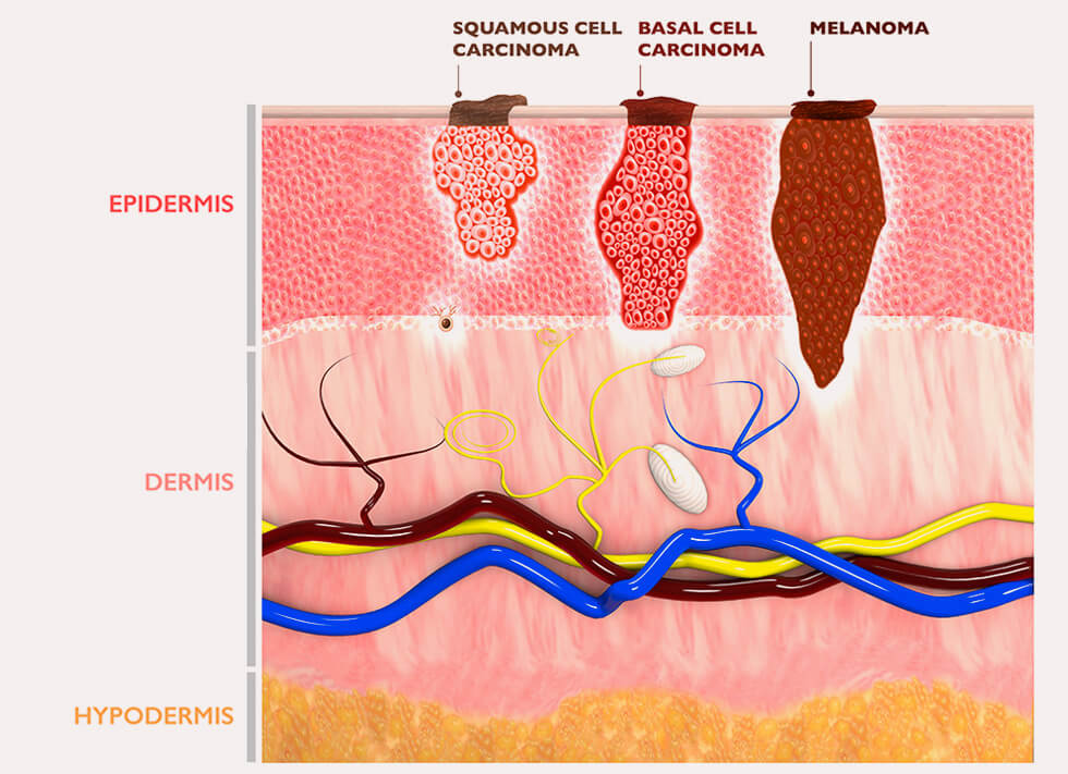 Skin cancer begins in the top layer of our skin, known as the epidermis. Within the epidermis, there are three types of cells.
