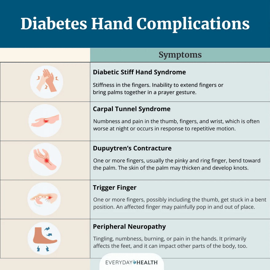 - Why it happens: Similar to diabetic stiff hand syndrome, high blood sugar can affect the connective tissues in the hands and shoulders, causing inflammation, thickening, and scarring of the tendons and joint capsule.