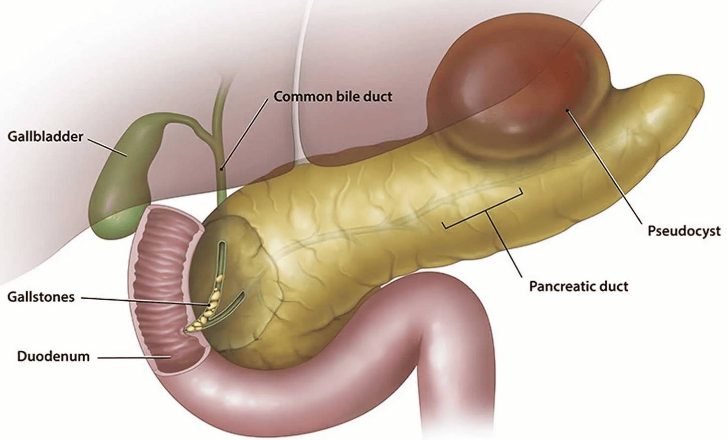 These are fluid collections that form around the pancreas when pancreatic fluids leak from the pancreatic ducts due to injury or inflammation. It normally occurs after an episode of pancreatitis, which can be acute (sudden) or chronic (long-term).